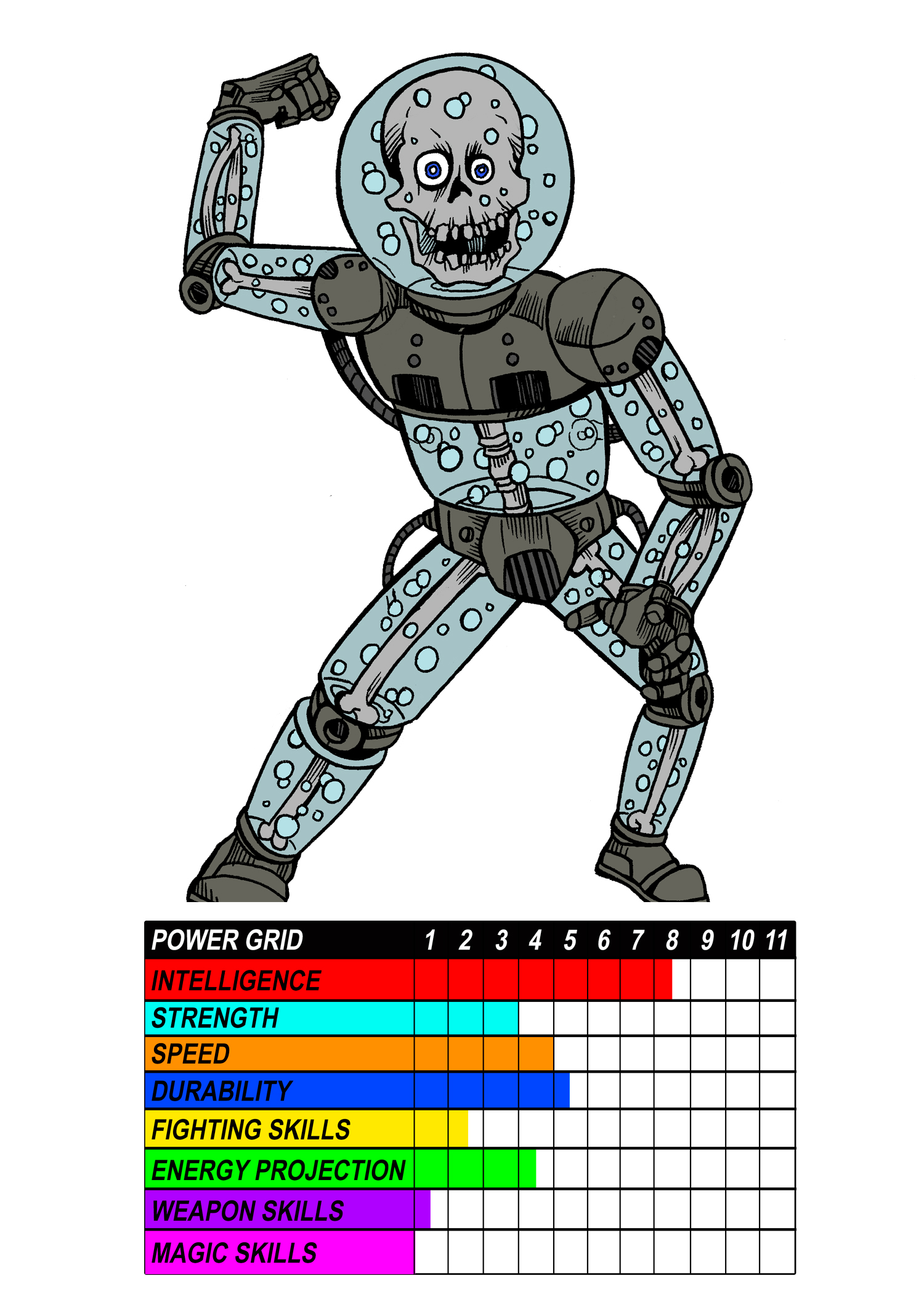 POWERS: Skulltank posses remarkable, natural intelligence, further enhanced by the circuitry in his suit. While the Bio-Tank that contains bones and brain keeps him alive, it also improves his strength and speed.