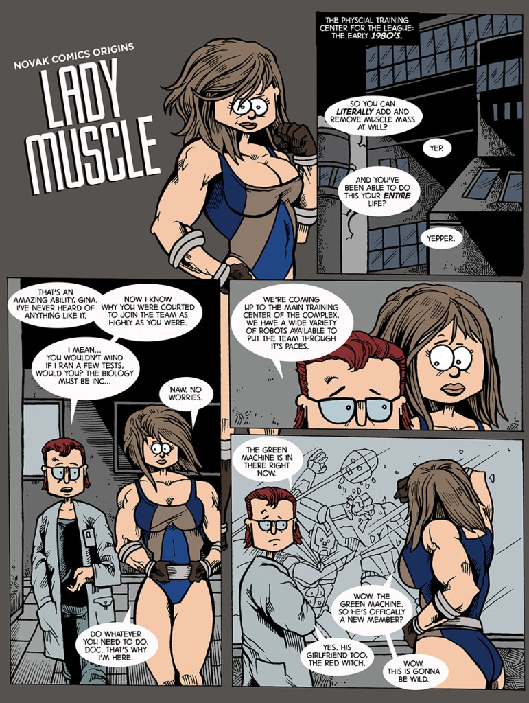 NOVAK COMICS ORIGINS – LADY MUSCLE – PAGE ONE